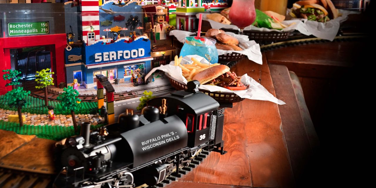 Bring your family along to enjoy a one-of-a-kind dining experience at Buffalo Phil's Wisconsin Dells! Miniature trains deliver food right to your table. While you're here, check out our massive collection of Brick Cities. Buffalo Phil's is locally owned and is open year-round! Our large building accommodate 500+ customers and is perfect for large groups. The mouthwatering menu includes foods such as Rotisserie Chicken, BBQ Pizzas, Burgers, Sandwiches, Pasta, Steak, Seafood, and Lil Buckaroo Meals. Buffalo Phil's is connected to Knuckleheads Trampoline Park • Rides • Bowling with Booby Trap Escape Rooms and the Outlets at the Dells right next door! That's a lot of fun in one convenient stop